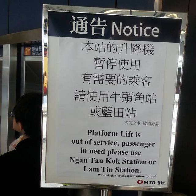 前段时间网上对一个港铁车站里的上面这个标吐槽。一个非官方账号回复说,因为这个站唯一的电梯里贴的许可证被乘客撕走了,只好停用电梯。而改用其他车站的电梯,是港铁一贯的应急方案。(然而牌里没有提到易达车就是车站傻了)