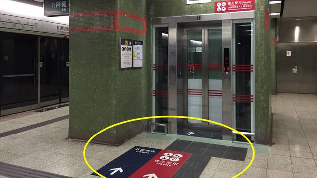 在香港,大部分电梯都是要排队的,而在地铁里,用电梯的人没有多到那么夸张。港铁花了很大功夫印了一大堆标识,让用电梯的人排成两队,其中一边是优先队。