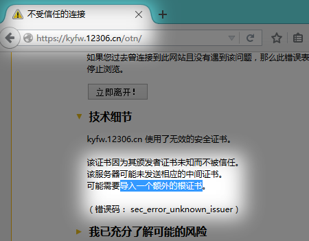 所以,除非迫不得已,机智的人不会去安装不信任的根证书,而会用其他信任单张证书的办法。我们铁老大的 12306 就是不信任证书的典范。问题来了,为什么他们不去买别人的证书,而是用自己签发的证书呢?除了“我们没钱也不知道怎么买证书”(这点已经被证明是错的) 、“我们的证书不能掌握在外人和外国人的手中”和不能说的原因,我也不知道。