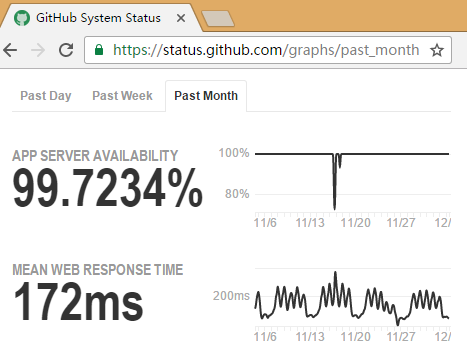 有的服务商还会在这个服务故障页面做一个统计数据显示的功能,显示的数据通常会是服务可用时间百分比、页面加载时间等等跟服务性能相关的数据。按照时间画出折线图,就非常清楚了。可能你会觉得“你看那个可用时间都没到 100%,显示出来不是很难堪吗”,他们可能觉得直面人生更好吧。当然这个数据的真实性是要靠服务商自己保证的,很奇怪这类网站似乎不像其他行业那么崇尚造假。