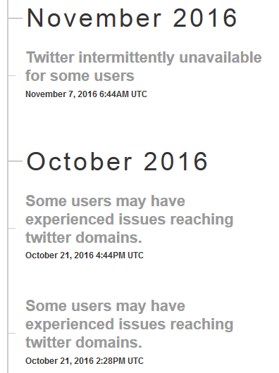 然后呢,网页上面会显示当前网站下各个服务的状态。如果有故障的时候,维护人员会把故障设置为不同的状态(比如正在调查、正在修复),然后可以写上具体的文字说明的状况,比如具体哪里出了问题、有多少用户会受到影响等等。每一步的维护进度都可以按照时间发布显示。