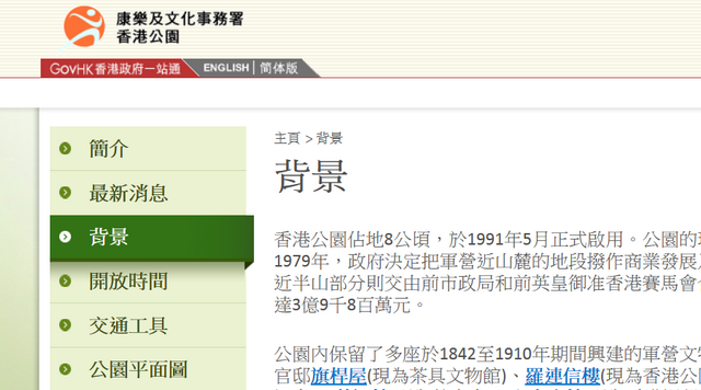 举点例子。比如康乐及文化事务署的网站。由于这个部门管理着香港几大政府公园,网站里就有这几个公园的分网站。这几个分网站格式统一,内容各异,公园历史、开放时间、项目等一应俱全。用不着去各大旅游网站,查找这些最基本的信息了(当然,看游客评价还是得去那些网站的)。