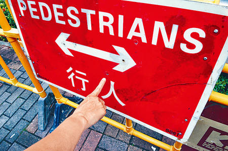 而在香港,似乎因为政府要求严格,任何会占用行人道的施工,都要考虑行人的交通安排,要画出地图来,摆出指引牌来,该有隔离栏的弄隔离栏。在这种地方的行人道上,要是“走不过去”,我一定会先怀疑自己是不是错过了什么牌子,什么可以“过去”的地方。
