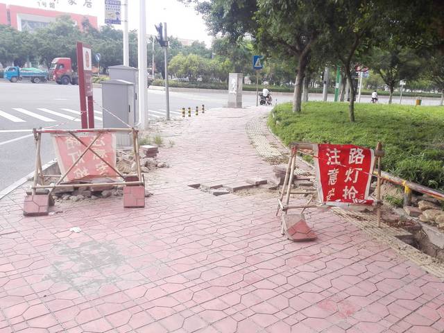 这个是大陆某经济特区。摆了牌子算是不错的了,不过你把地砖拆到路中间了,不施工的时候也不收一下吗。