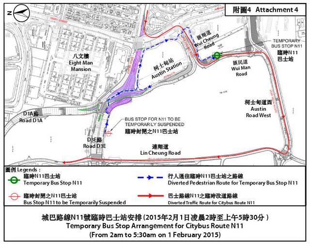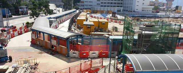 走着走着,突然来到了一处超大型工地旁,这是高铁香港总站的工地,想必是如火如荼,按照大陆的经验,身边一定是尘土飞扬。然而,行人道却用隔离栏专门和汽车道分隔,过了路口还有专门的指示牌指引临时行人道的方向,地上还挺干净。并不宽的行人道上,迎面走来许多工地工人,看起来是去吃中饭。
