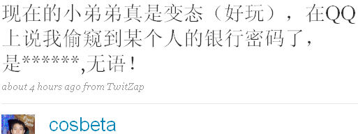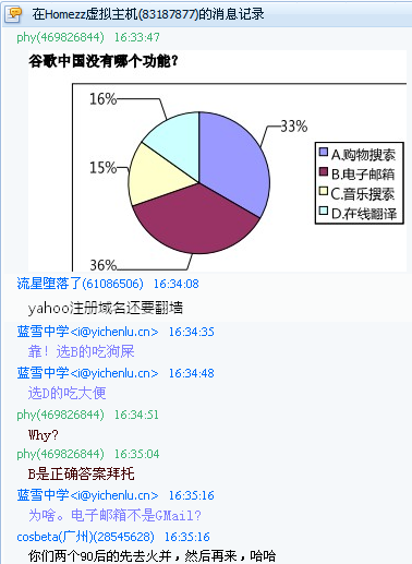 发布于2009-08-14 Phy2590后轶事 最近不知为何,90后成了我在的这小群体里的关键词。具体如下:(图太多我就不多解说了) 疑似前兆(via) 关键词开发第一炮(via) 第1枪:谷猫(Gmail)门 第2枪:题刻踢客(Ticket)门(via) 题刻门连锁反应 第3枪:笔误门 笔误门连锁反应 应该是到此为止了。 PS:以后要养成一天一篇博客的强制习惯! ===== 补充:当事人很生气,比高高的那堵东西还要厉害。于是,特补充本文章中的主角的网站链接—— 蓝蓝小雪 撒花…… 请把这篇文章当成是那天不少的笑料的一个记录吧,别生气啊。